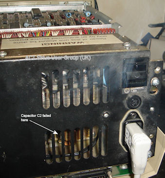 This is how the capacitor looked after taking apart the power supply casing. As can be seen the capacitor has blown apart.