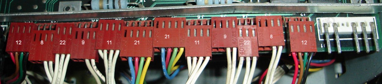 This is a standard Disk Controller that is used in both Single and Double sided configurations. There are many floppy drive plugs needing connection to the controller. All plugs have a number printed on the 'down' face of the plug but not all controller boards have corresponding signage printed on them. The image below shows a full row of plugs for a single sided floppy machine. Regardless of what type of floppy drive fitted it is important that the numbers on the plugs are fitted in the correct order. Some floppys appear to have a plug or two missing but whatever plugs ensure they are fitted onto their correct set of pins.