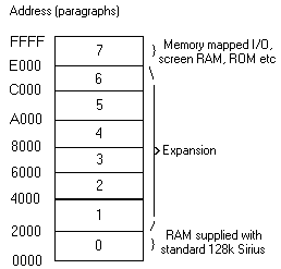 Memory Organisation The total address space of the ACT Sirius 1 is 1M byte (or 64K paragraphs; a paragraph being 16 bytes). For convenience this can be considered as 8 blocks of 128K, as follows: