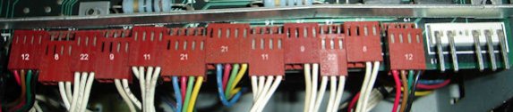 This is a standard Disk Controller that is used in both Single and Double sided configurations. There are many floppy drive plugs needing connection to the controller. All plugs have a number printed on the 'down' face of the plug but not all controller boards have corresponding signage printed on them. The image below shows a full row of plugs for a single sided floppy machine. Regardless of what type of floppy drive fitted it is important that the numbers on the plugs are fitted in the correct order. Some floppys appear to have a plug or two missing but whatever plugs ensure they are fitted onto their correct set of pins.