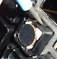 The white key plunger is removed by placing the unit on a vertically held snugly fitting hexagonal key or small screwdriver and pressing the Keytronic case down. There will be a small amount of resistance and a 'click' but it will release. Do not over apply pressure and do not damage the foil or now the exposed foam cushion on the key plunger.