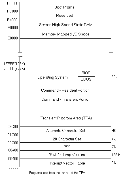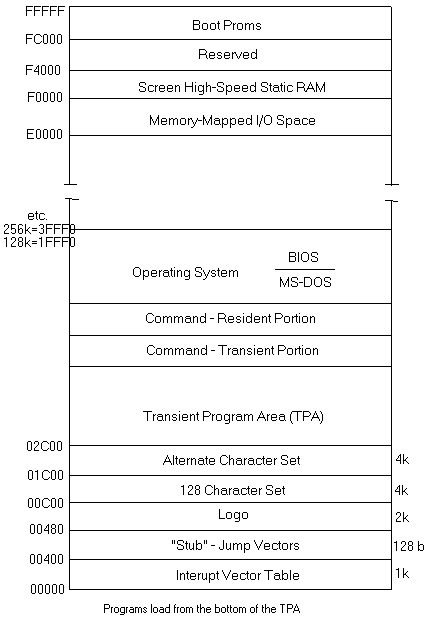 Note: that in CP/M-86 user programs load in the Transient Program Area (TPA) from the top down, whereas in MS-DOS , they load from the bottom up. CP/M-86 Memory Map